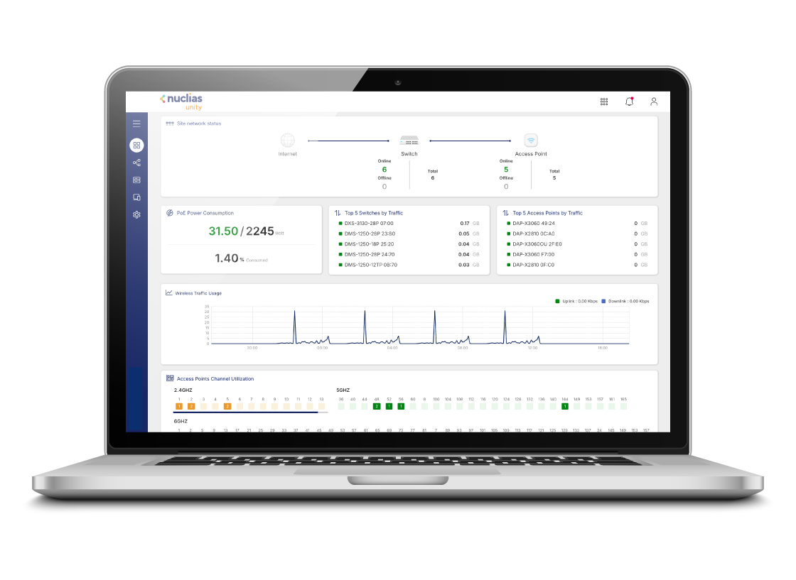 Nuclias Unity is uw single-pane-of-glass voor volledige, cloudgebaseerde netwerkcontrole. Verenig de setup, monitoring en beveiliging van al uw AP's en switches vanaf één intuïtief dashboard – zonder extra licentiekosten. Visualiseer uw hele netwerk op een live topologiekaart, push gecentraliseerde configuraties met één klik en ontvang proactieve waarschuwingen. Implementeer sneller, los problemen slimmer op, vereenvoudig uw IT-leven en win uw tijd terug.