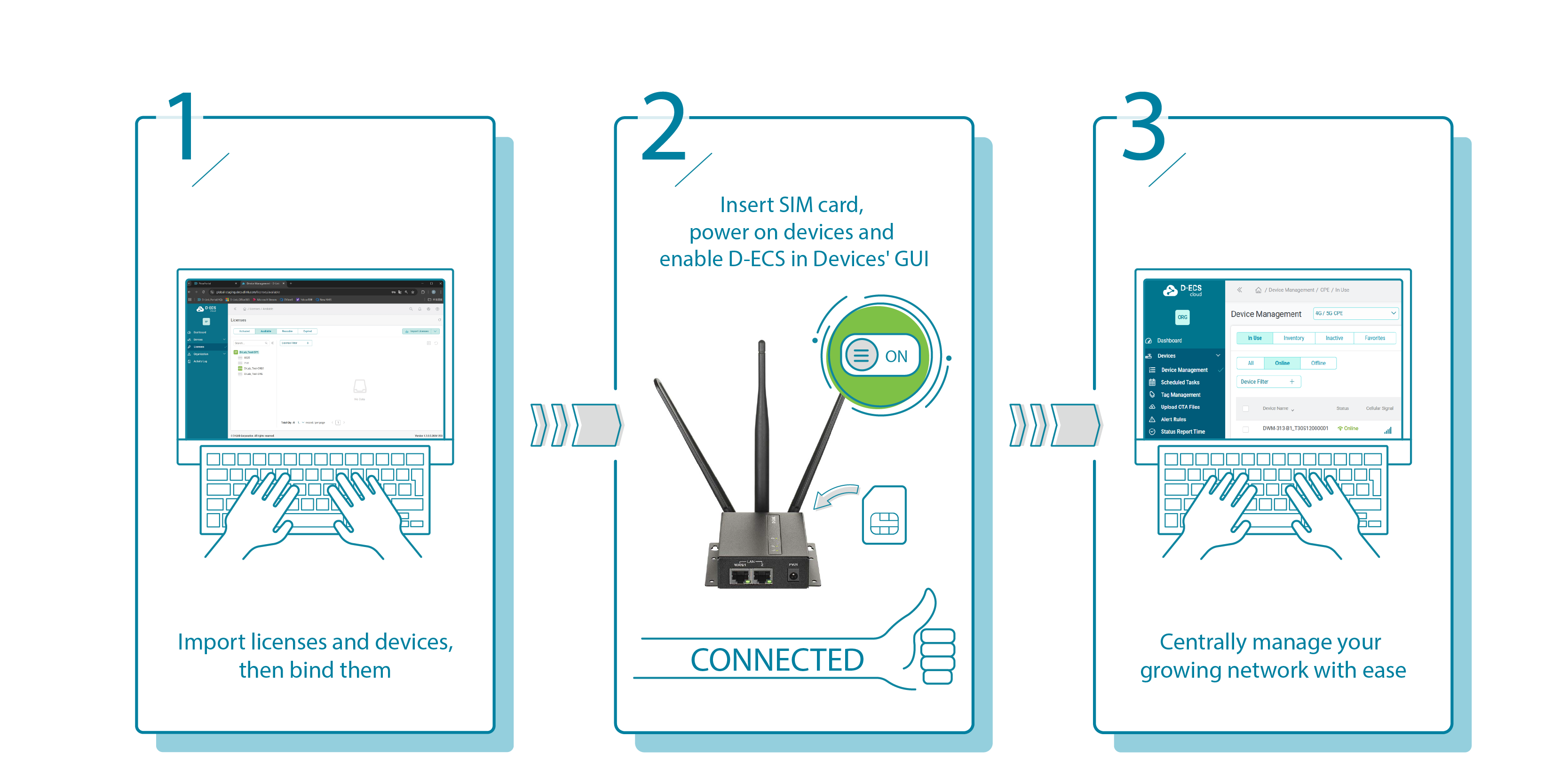 D-ECS is een veilig, cloud-based platform, gehost op AWS dat het remote management van uw 4G/5G M2M-apparaten vereenvoudigt – geen technische expertise vereist. Of het nu gaat om het beheren van routers, modems of gateways, D-ECS biedt schaalbare controle vanaf elke locatie via een intuïtief dashboard.