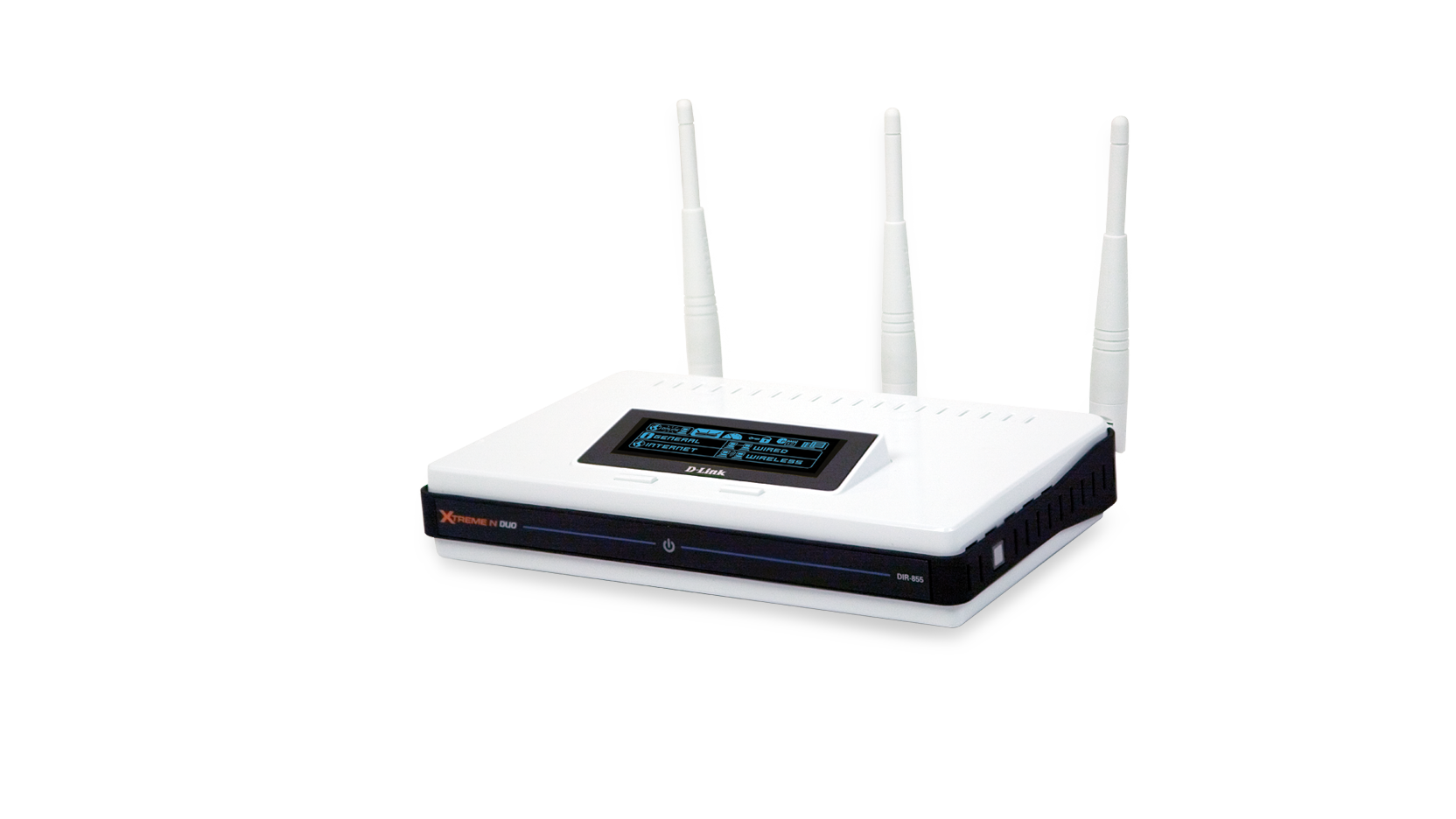 The D-Link DIR-855 Gigabit Router is a 802.11n device that delivers up to 14x faster speeds¹ and 6x farther range¹ than 802.11g, while remaining backward compatible with 802.11g devices. Powered by Xtreme NTM technology and equipped with three external antennas, this router provides superior wireless coverage for larger homes and offi ces, or for users running bandwidth intensive applications. Connect the router to a cable or DSL modem and provide high-speed Internet access to multiple computers, game consoles, and media players. Create a secure wireless network to share photos, fi les, music, videos, printers, and network storage. The DIR-855 comes with dual-band function, which concurrently supports 2.4GHz and 5.0GHz radio frequencies, an LCD panel, and a 4-port 10/100/1000 Gigabit switch that connects Gigabit wired devices for lag-free network gaming and fast fi le transfers.
