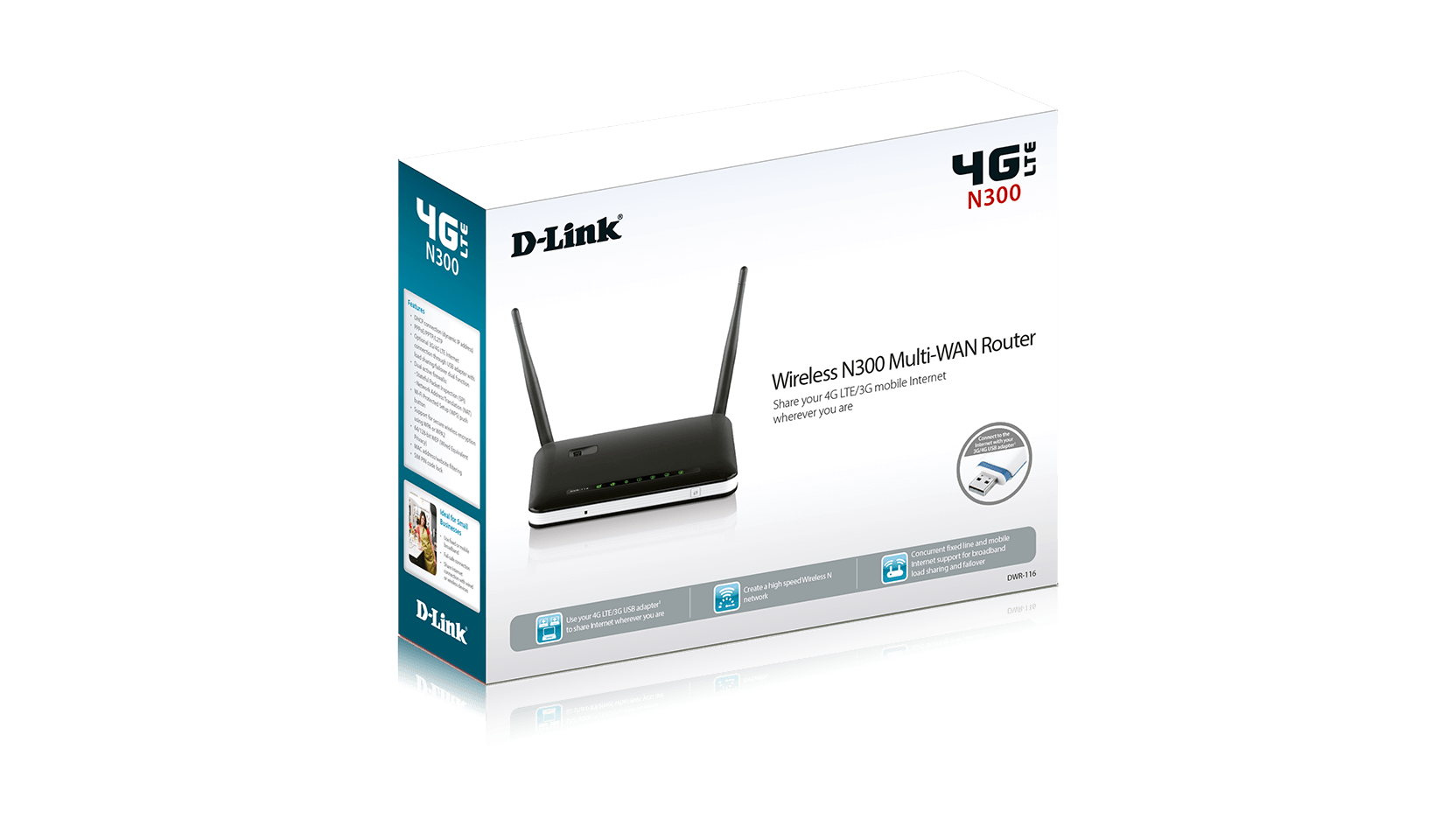 De DWR-116 Wireless N300 Multi-WAN Router stelt u om staat om supersnel mobiel 4G LTE/3G-internet3 gelijktijdig te delen met uw smartphone, tablet, notebook en pc. Dankzij de ondersteuning van universele 4G LTE/3G USB-dongles van alle mobiele providers3 is deze router ideaal voor het tot stand brengen van een internetverbinding die voor het werk met collega's en op vakantie met familie en vrienden kan worden gedeeld. Wireless N stelt u in staat om een snelle en veilige persoonlijke hotspot te creëren met draadloze snelheden tot max. 300 Mbps1. Ondersteuning voor gelijktijdig mobiel 4G LTE/3G-internet en vast breedbandinternet biedt u de mogelijkheid om internetverbindingen te combineren en zo hogere internetsnelheden te realiseren. U kunt bovendien een Failsafe internetconfiguratie realiseren voor het geval dat een van de verbindingen uitvalt.