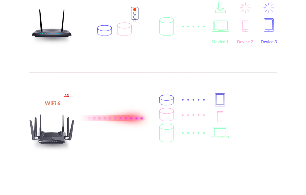Wi-Fi 6 uses a combination of OFDMA and MU-MIMO technology to increase the total number of devices your network can effortlessly handle by up to 4x, so you can bring more of the latest tech into your smart home. And OFDMA transmits to multiple devices simultaneously to make sure everyone using the home Wi-Fi uses it with unprecedented efficiency.