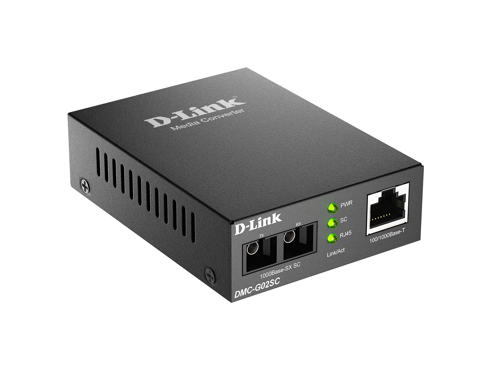 The DMC-G02SC is a media converter designed to convert a twisted-pair 100/1000Base-T Gigabit Ethernet connection to a multi-mode fibre 1000Base-SX Gigabit Ethernet connection to extend a connection distance (up to 550 m) between two devices. This media converter is equipped with one RJ-45 for twisted-pair and one fibre optic SC port.