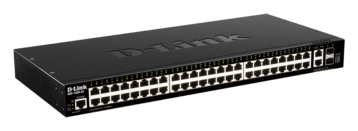 Możliwość stakowania do ośmiu przełączników DGS-1520 przy użyciu miedzianych portów 10GBASE-T i / lub światłowodowych SFP+. Wsparcie stakowania hybrydowego zwiększa możliwości i obniża koszt okablowania dzięki zastosowaniu miedzi zamiast światłowodu.