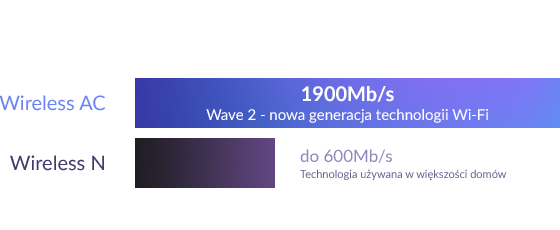 Korzystaj z szybszych połączeń WiFi dzięki najnowszej technologii AC Wave 2, umożliwiającej trzykrotnie szybsze przesyłanie danych niż w przypadku urządzeń generacji Wireless N.