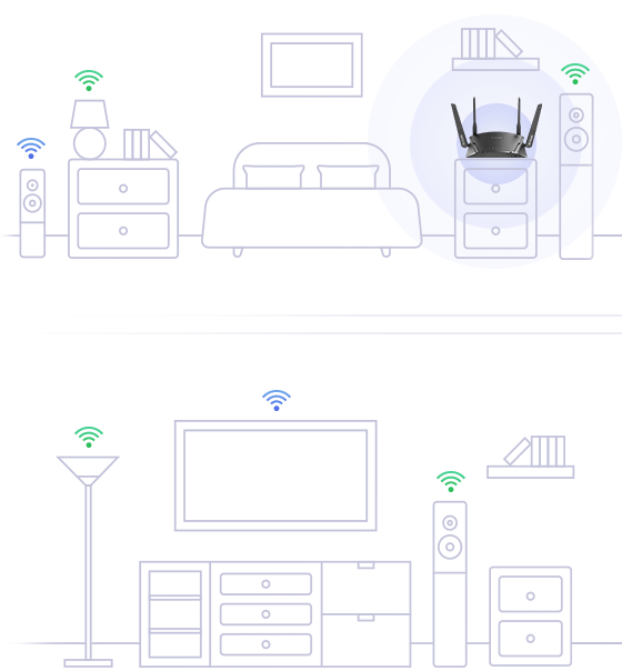 DIR-2660 udostępnia jednocześnie dwa pasmach sieci Wi-Fi - 2,4 GHz oraz 5 GHz, za sprawą dwuzakresowej technologii oraz MU-MIMO. Dzięki temu każde mobilne oraz inteligentne urządzenie w domu korzysta z najlepszego dostępnego pasma i szybkości.