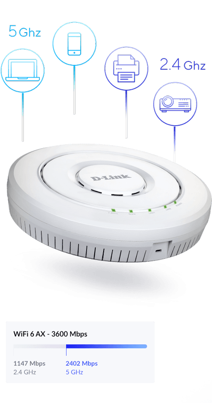 Dwuzakresowy punkt dostępowy Unifed Wi-Fi 6 AX3600 z najnowszym standardem Wi-Fi przeznaczony dla małych i średnich firm, a także dużych przedsiębiorstw. Jest to część rozwiązania Unified Wireless D-Linka, które umożliwia zbudowanie skalowalnej i łatwej w zarządzaniu sieci Wi-Fi.