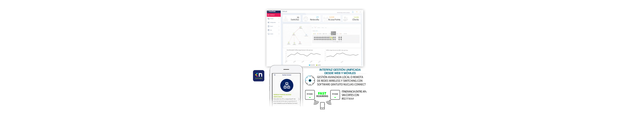 O software gratuito Nuclias Connect (DNC-100) permite a administração avançada, local ou remota, de redes unificadas de Pontos de Acesso WiFi da gama D-Link DAP e Switches Smart Managed da família DGS-1210* Nuclias Connect facilita a escalabilidade da rede à medida que se descobrem e aprovisionem ao perfil de rede novos switches e pontos de acesso, o que permite a sua rápida administração a partir de uma conta single sign-on A interface intuitiva está disponível em navegador web ou numa app, que também permite aprovisionar o ficheiro de rede unificada a múltiplos pontos de acesso em bloco desde o móvel para facilitar a instalação de redes Wireless com alta densidade de pontos de acesso. Também é possível configurar desde a app pontos de acesso em modo Standalone para instalações mais pequenas.