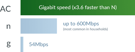 Wireless AC provides Gigabit wireless speeds with up to 3.6 times the performance of the most common type of Wi-Fi found within most households.