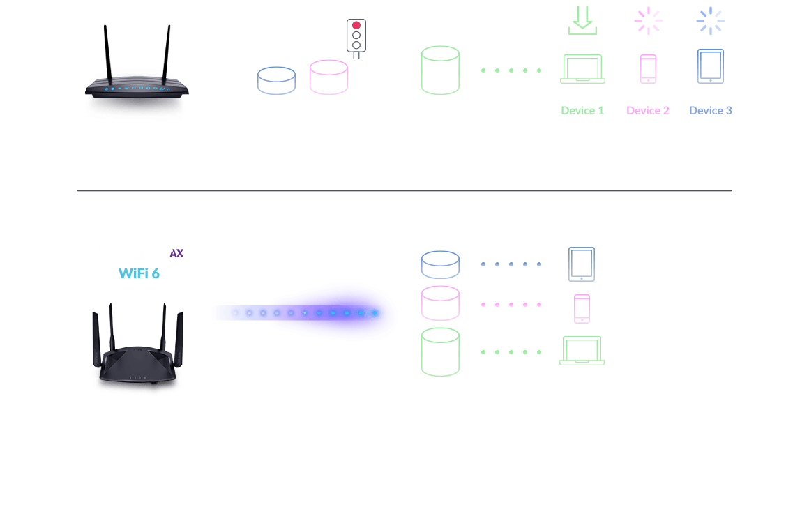 Wi-Fi 6 uses a combination of OFDMA and MU-MIMO technology to increase the total number of devices your network can effortlessly handle by up to 4x, so you can bring more of the latest tech into your smart home. And OFDMA transmits to multiple devices simultaneously to make sure everyone using the home Wi-Fi uses it with unprecedented efficiency.