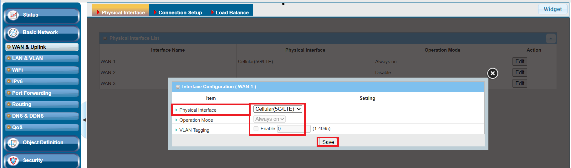 Go to Basic Network > WAN & Uplink > Physical Interface tab