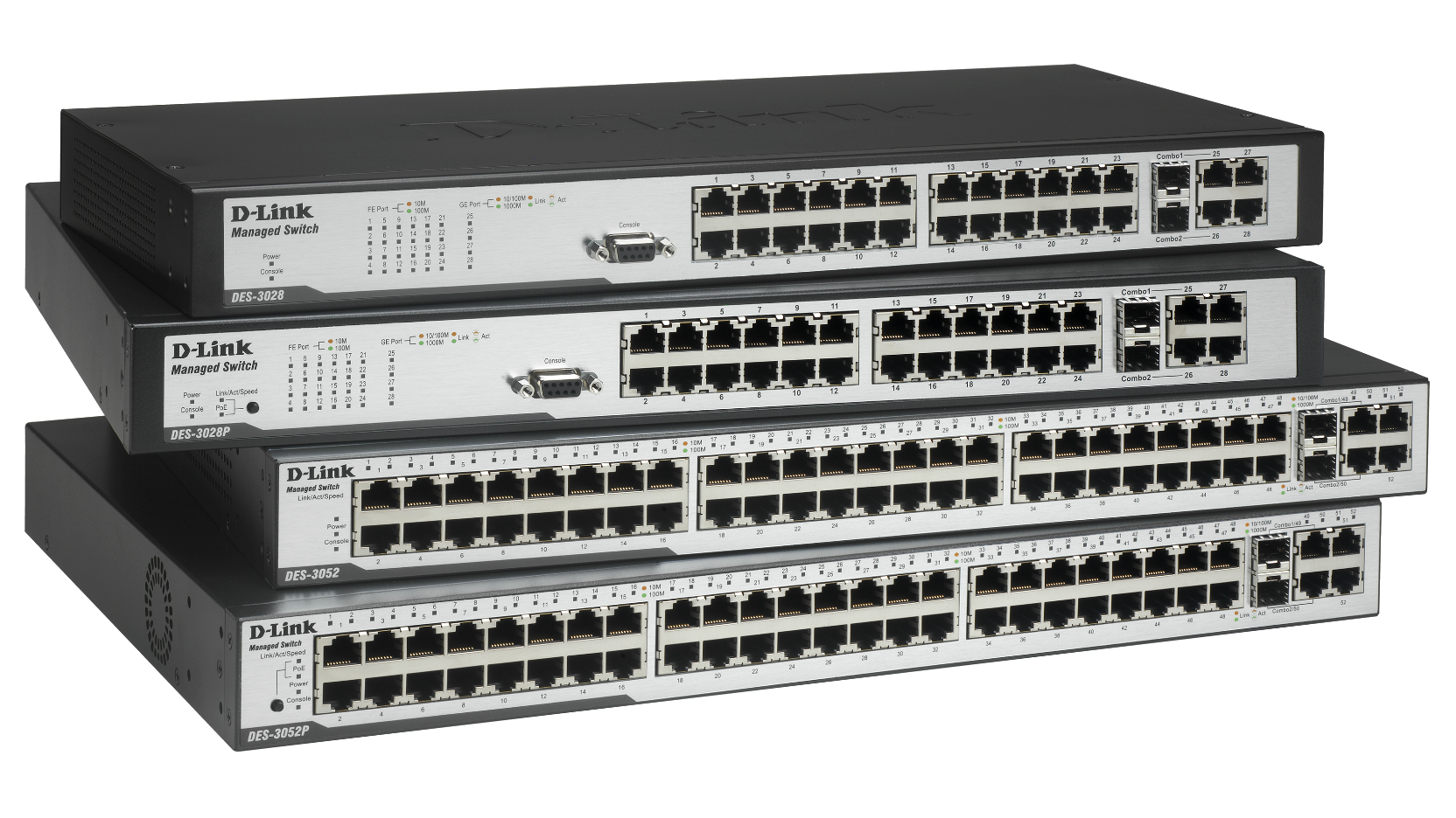 - DES-3052P: 48-Port Fast Ethernet L2 Managed PoE Switch with 2 x 1000BASE-T and 2 x Combo 1000BASE-T/SFP ports (48 x PoE ports, 3 fans)