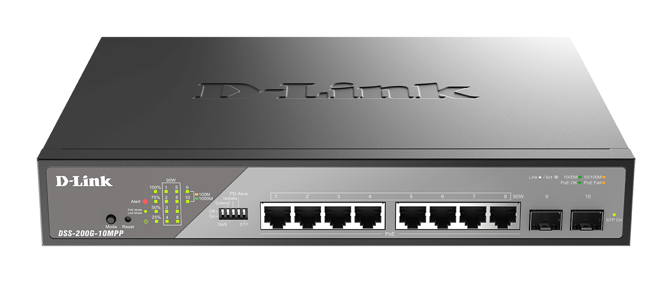 See your remaining power availability with the built-in PoE Power Budget LEDs for 25%, 50%, 75%, and 100% power usage at a glance. And utilise up to 518W, with 90W on 8 ports and 30W on 15 ports for DSS-200G-28MPP, so you can rapidly deploy more devices.