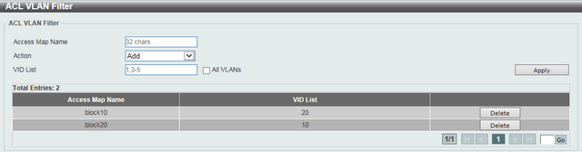 Enter ACL VLAN Filter, enter the Access Map Name "block10" created earlier to block the VID 20 and repeat the procedure for the Access Map Name "block20" and VID 10.
