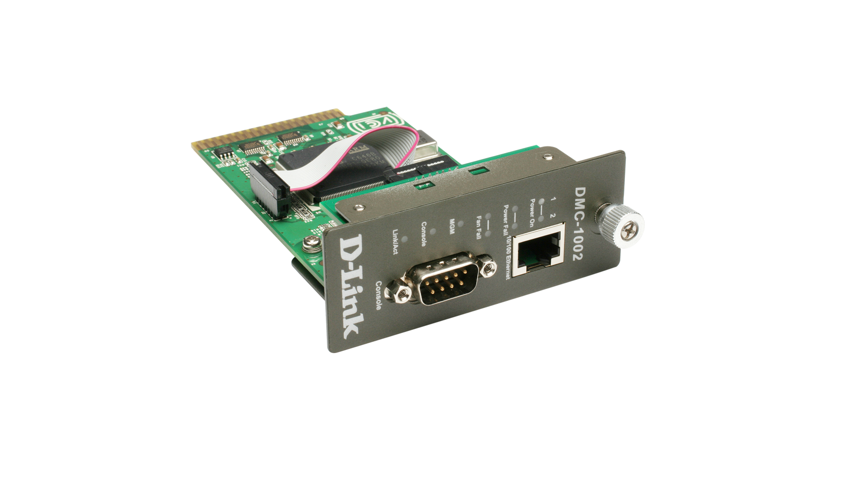 This module provides SNMP-based and web-based management of all media converter and power supply modules installed in the DMC-1000 chassis. It features a 32-bit, high performance RISC microprocessor executing a real-time operating system. It provides a 10/100Mbps Fast Ethernet port for network connection, allowing you to configure and monitor the system through an SNMP management station or from a PC running an Internet browser. An RS-232 port is also provided to let you connect to a console (PC) to set configuration. The management module periodically polls all converters and power supplies in the chassis to collect information regarding status and configuration settings. It also receives traps for events such as module hot-swaps and power failures as soon as they occur, as well as warning traps, upon which alarms may be sounded out to alert you.