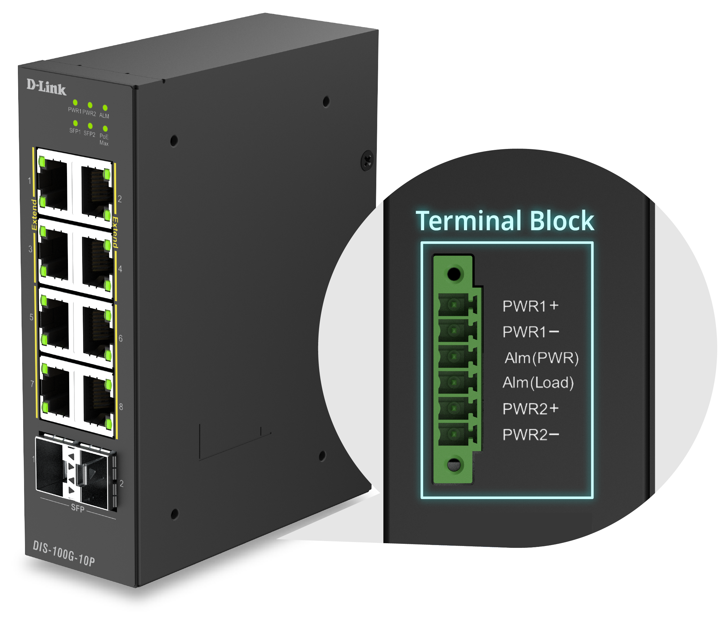 The DIS-100G-10P is equipped with eight PoE ports compliant with IEEE 802.3af/at standards, delivering both data and power through a single Ethernet cable. Using the built-in DIP switch, ports 1 - 4 can be set to “Extend Mode”, supporting transmission distances of up to 250 meters at 10 Mbps, perfect for surveillance cameras that require stable, long-distance connectivity.