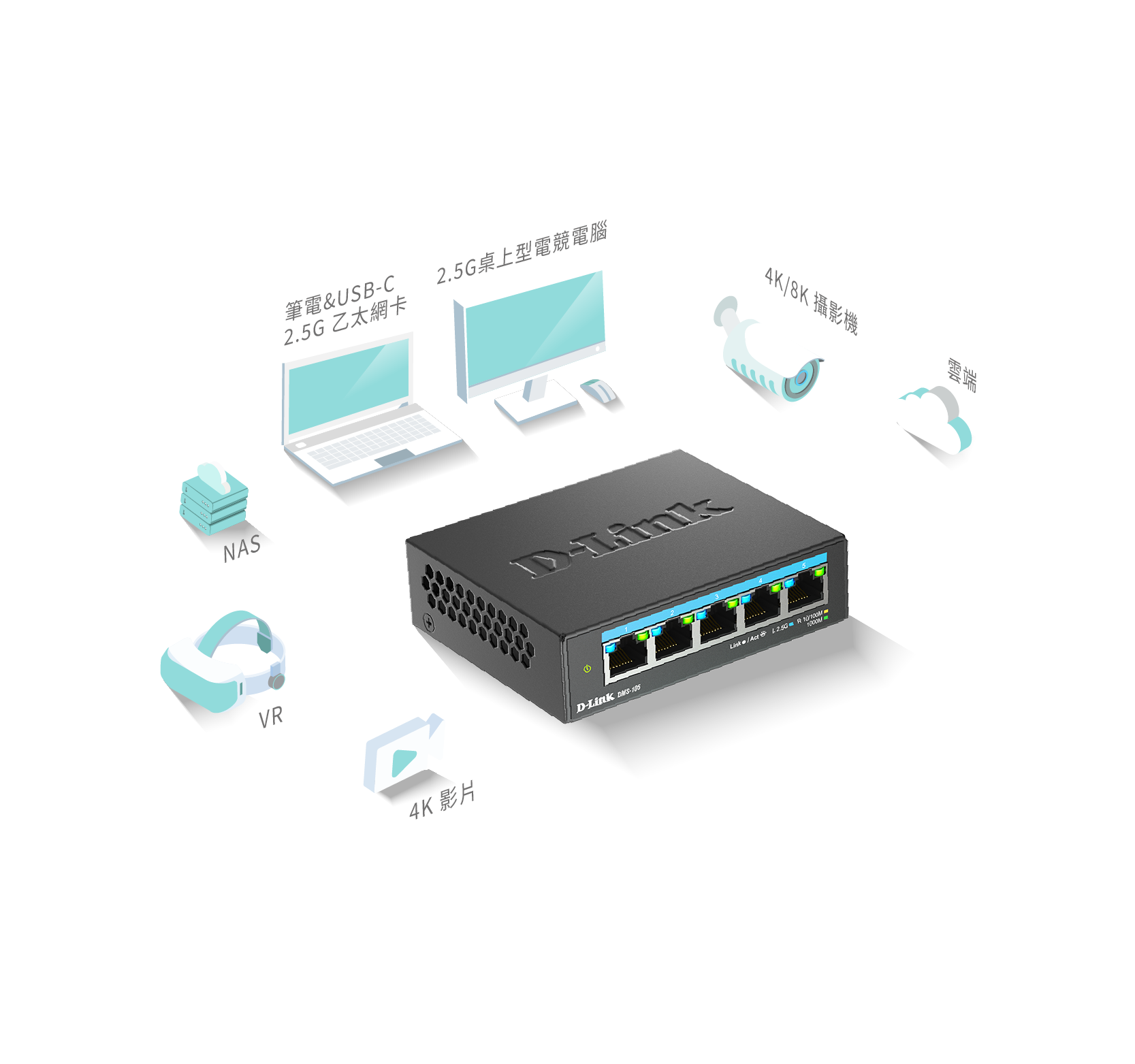 具備 5 個 2.5G 網路埠支援自動偵測 MDI/MDIX ,提供高達 25Gbps 交換器背板頻寬。