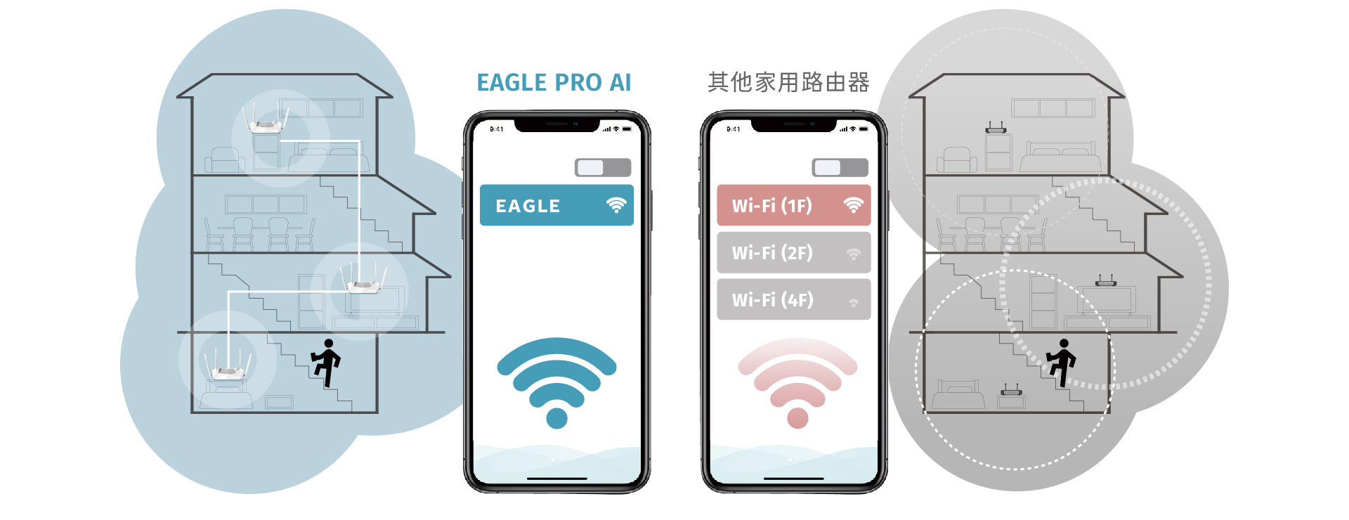 房間移動或跨越無線區域,也無需再切換帳號重新連線!智慧漫遊功能讓您用一組網路名
