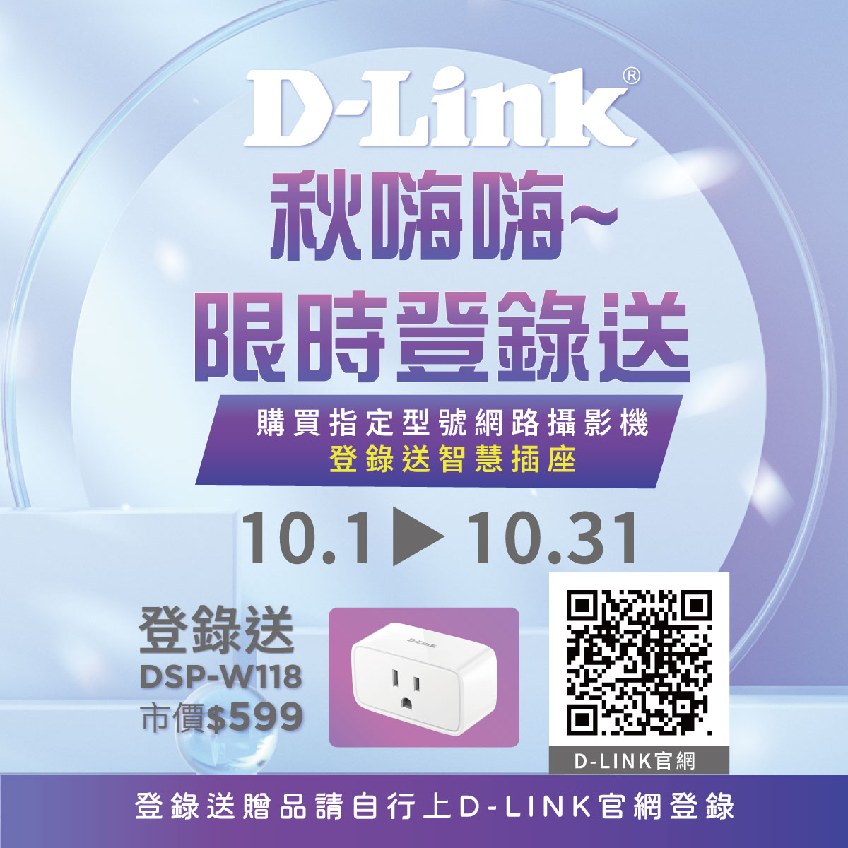 活動名稱:「D-Link好評加碼!購買指定MESH系列登錄送DSP-W118」
