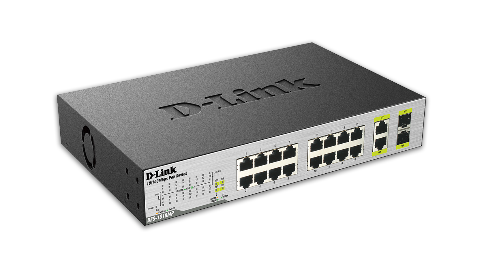 The D-Link DES-1018MP 18-Port Fast Ethernet PoE Switches with 2 Gigabit Uplink Ports enables users to easily connect and supply power to PoE-capable devices such as wireless access points (APs), network cameras and IP phones.