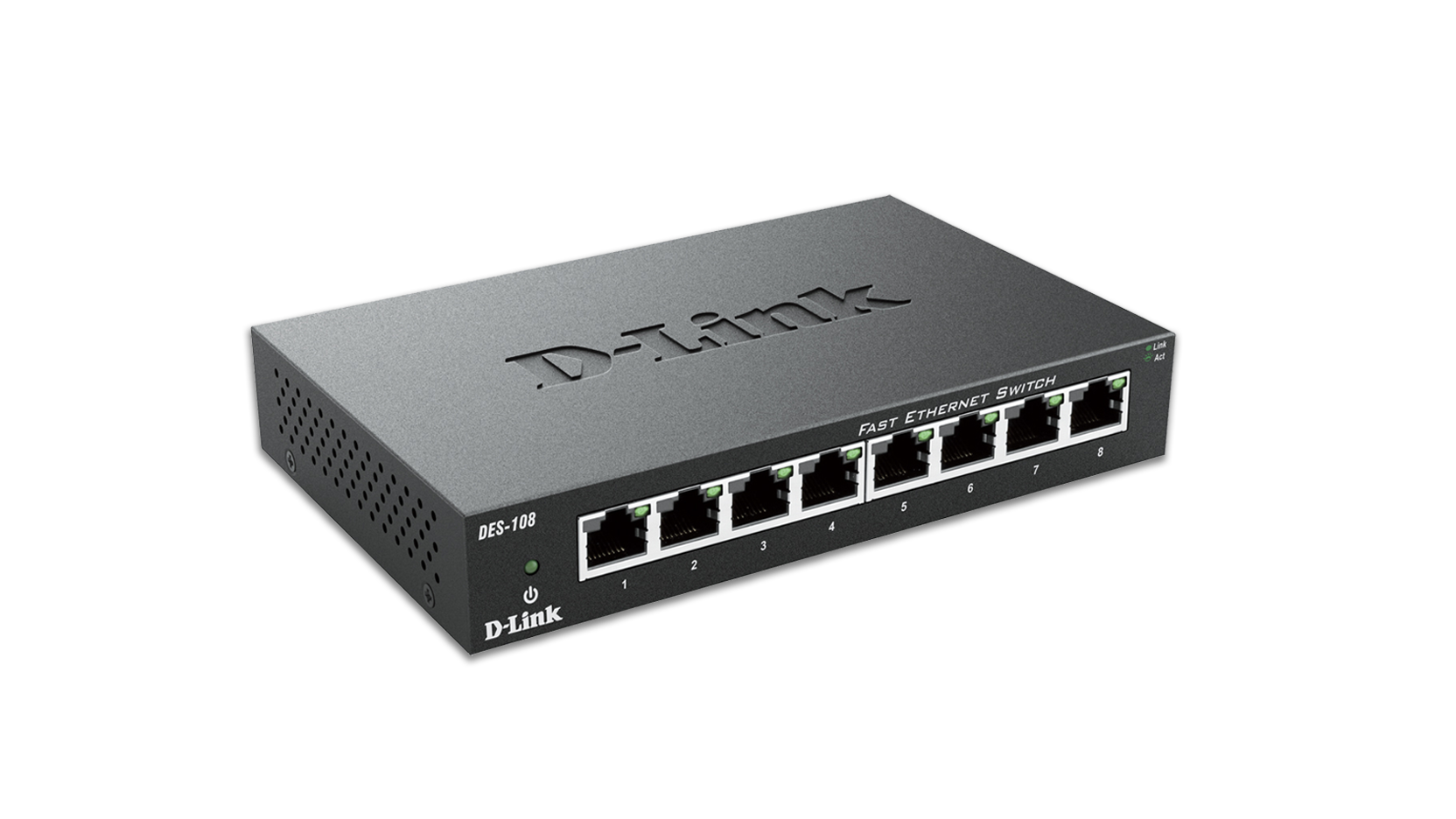 The DES-108 8-Port Fast Ethernet Unmanaged Desktop Switch is a 8-port 10/100 Mbps Fast Ethernet switch that allows you to quickly set up a wired network. Connect the DES-108 to multiple computers together to share files and folders, or connect it to a router to share an Internet connection.