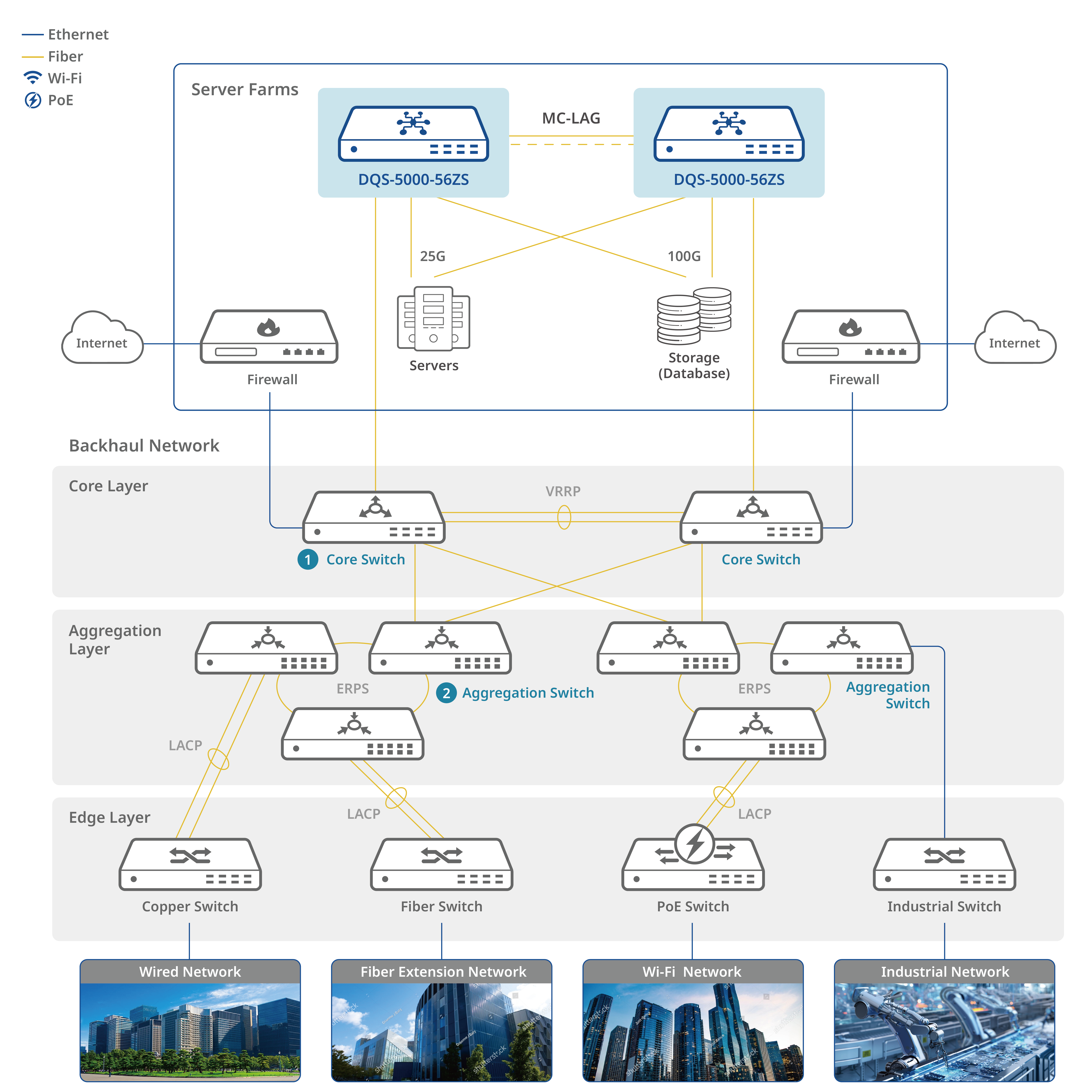 Traffic monitoring demands high-availability, high-performance network infrastructure. The DQS-5000-56ZS meets these needs with MC-LAG, hot-swappable PSU and fans, 25G downlinks for endpoint aggregation, and 100G uplinks for database and storage connectivity.