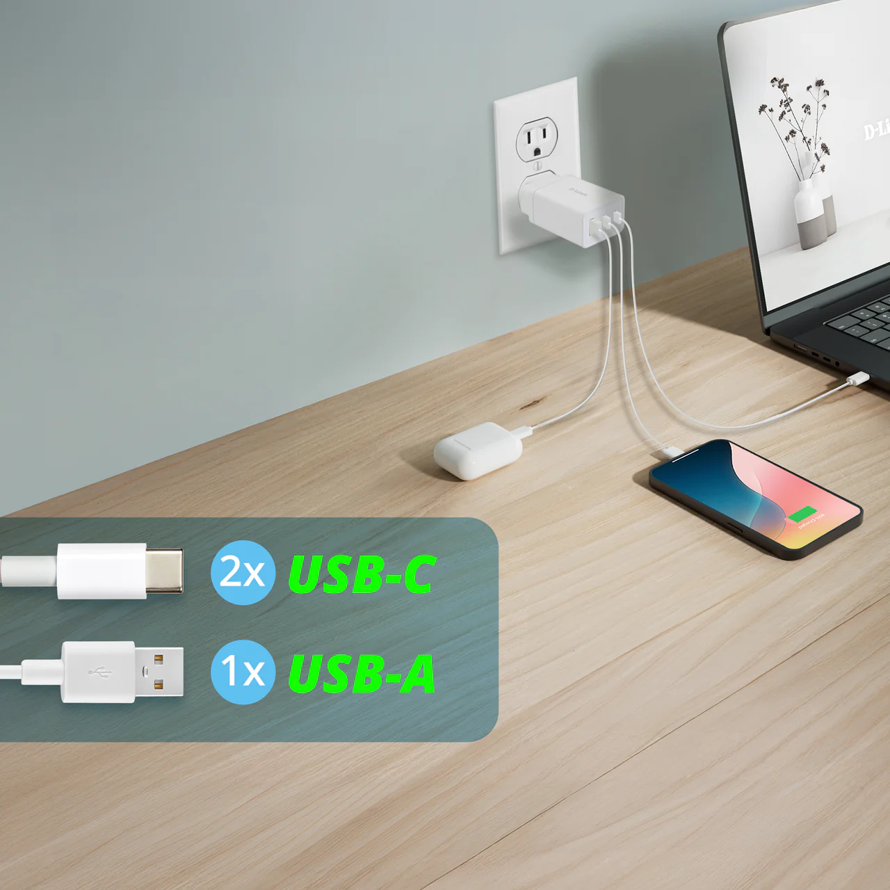 From morning meetings to evening downtime, the D-Link 65W GaN Charger (DCP-651) helps you keep your devices powered up. With two USB-C ports and one USB-A port, you can charge your laptop, phone, and smartwatch all at once*, at home, at work, or wherever the day takes you. One compact charger. Maximum productivity.