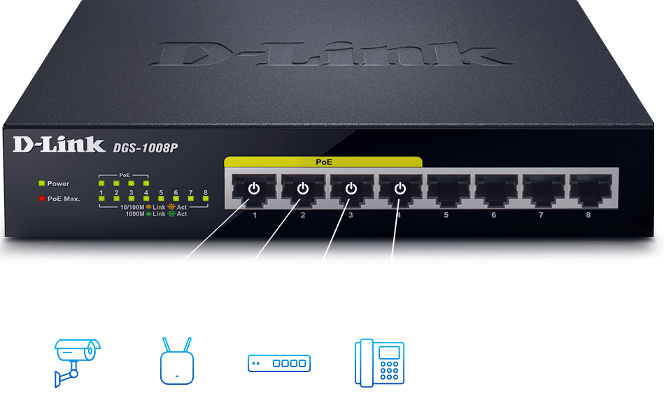 The DGS-1008P features four PoE ports to connect and power several devices at once.