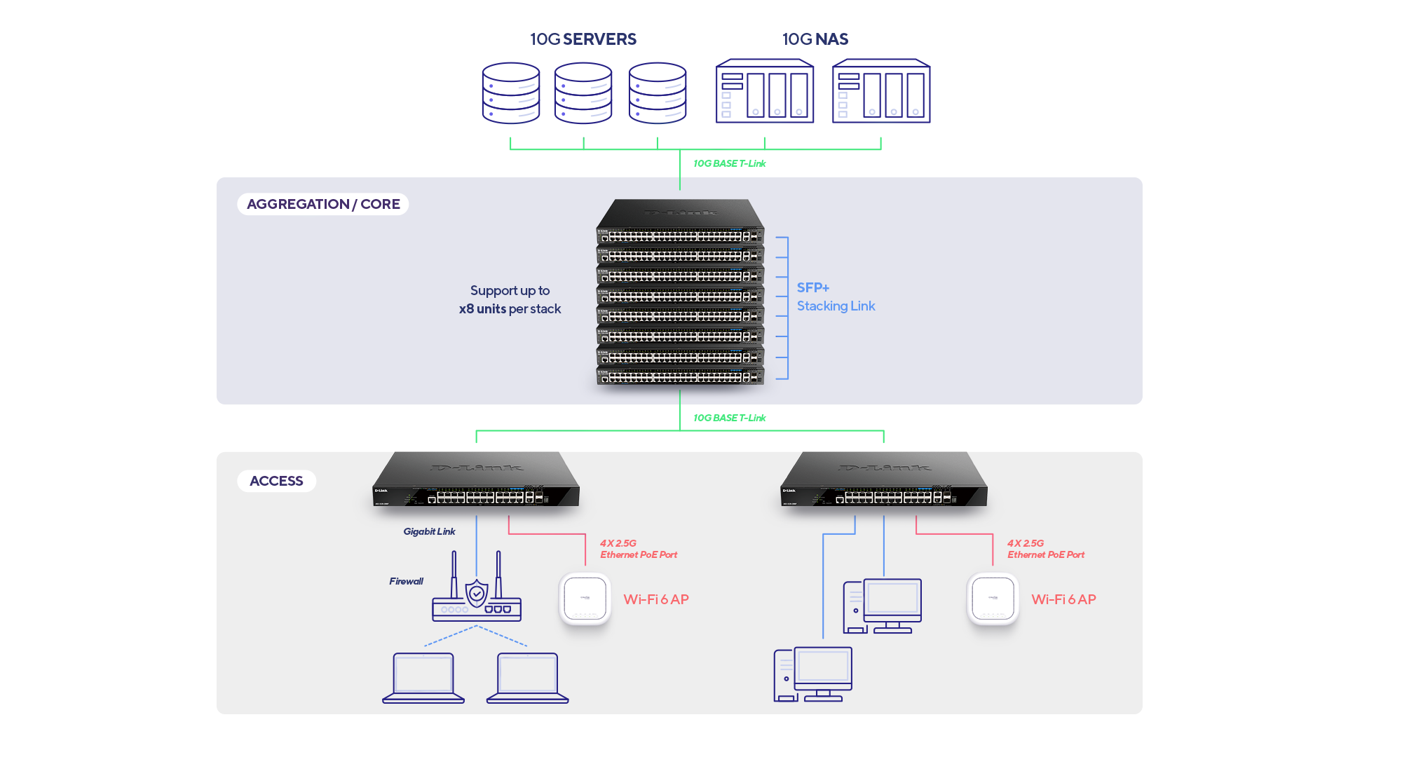 Multi-Gigabit 2.5G ports on the DGS-1520 Series PoE switches eliminate potential bottlenecks when connecting to Wi-Fi 6 access points capable of Gigabit+ wireless speeds.