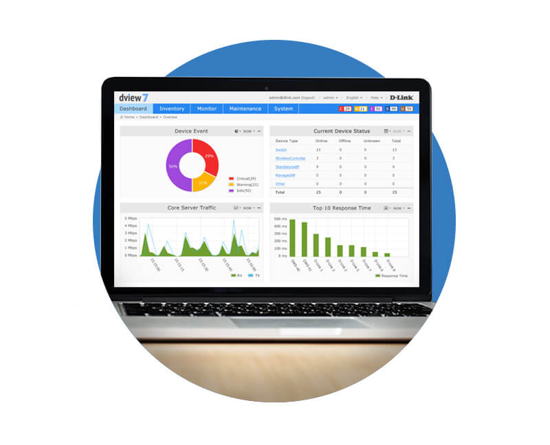 For more complex network infrastructures, D-View 7, a centralized management platform, can be installed for in-depth network management and maintenance to optimize network availability, reliability, security, and resilience.