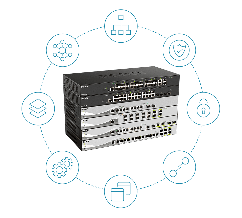 The DXS-1210 series includes layer 2 features such as port mirroring, Spanning Tree Protocol (STP), and Link Aggregation Control Protocol (LACP). They also support IP interfaces, ARP, IPv6 Neighbor Discovery (ND), default routing, IPv4/IPv6 static routing, IGMP and MLD Snooping, auto voice and surveillance VLAN, LLDP and LLDP-MED.