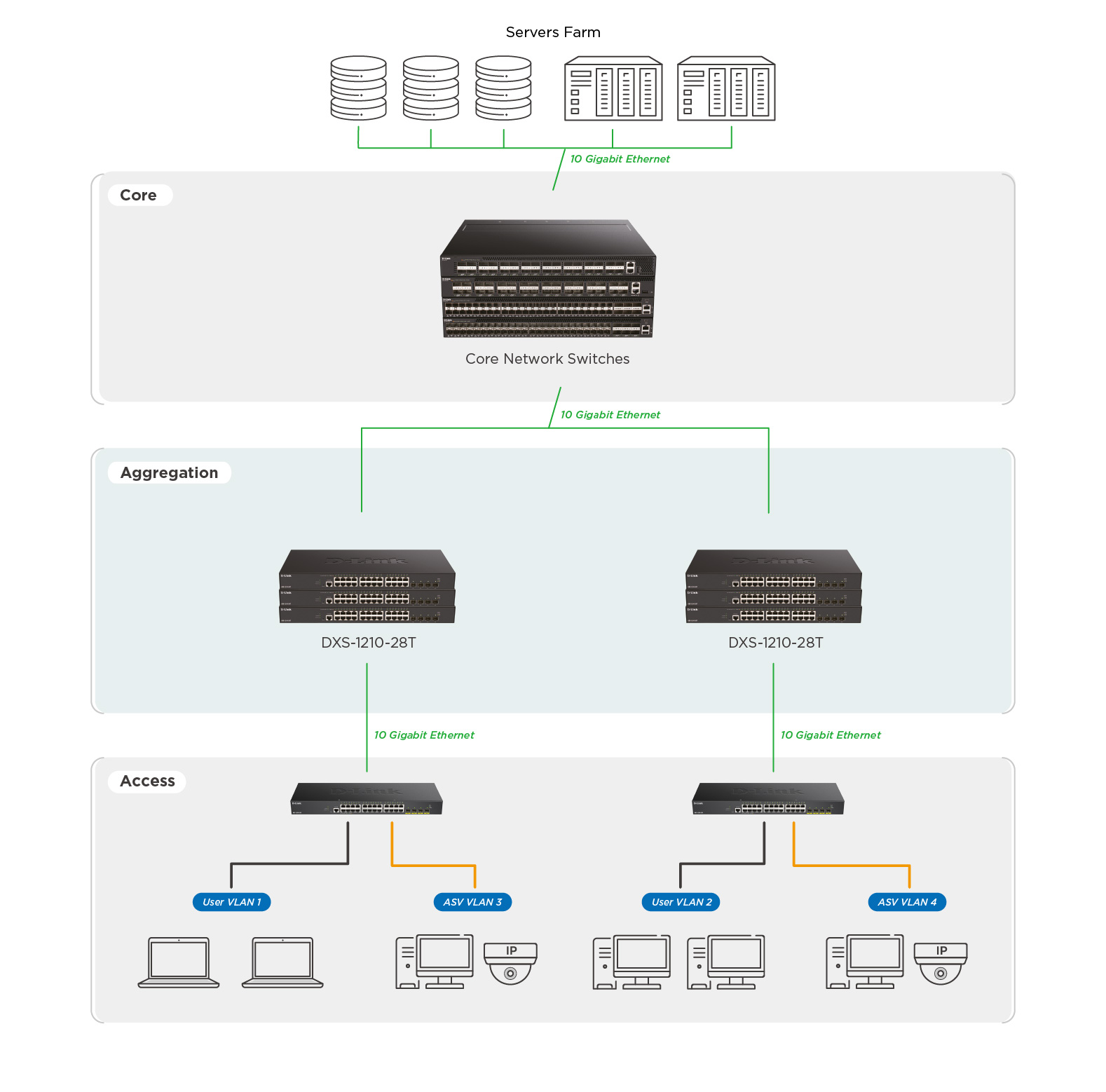 If you need surveillance or VoIP, there is no need to build a dedicated network. With the DXS-1210 Series, expediting latency-intolerant services such as surveillance and VoIP through the existing network can’t be any easier. Simply enable the Auto Surveillance VLAN & Auto Voice VLAN features. Your surveillance videos will always run smoothly and your VoIP calls will be crystal-clear from beginning to end, even during peak working hours.
