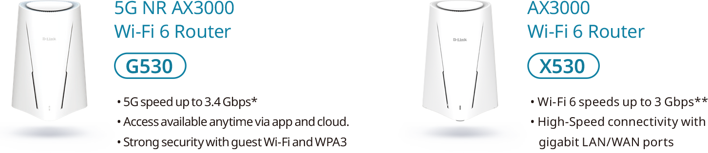 Dive into ultra-fast connectivity with 5G NSA mode, offering speeds up to 3.4 Gbps1. The G530 5G NR AX3000 Wi-Fi 6 router ensures you enjoy low-latency, high-speed Internet on both 2.4 GHz and 5 GHz bands, perfect for reliable home entertainment and efficient work.