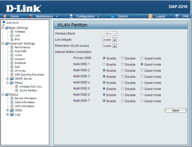 Step 3 - Go to “WLAN Partition” to indicate which SSID is going to use the Guest Mode.