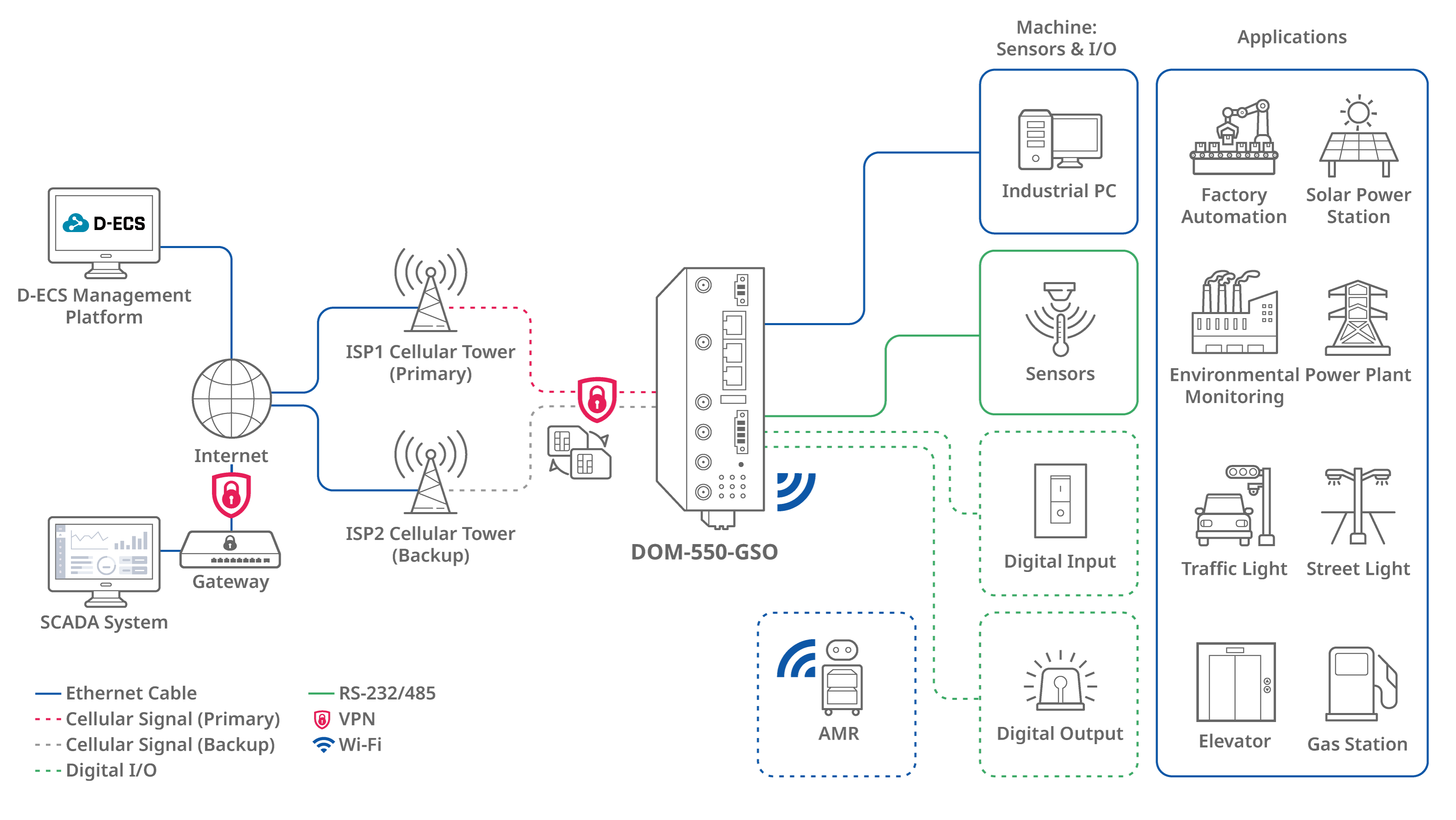 The DOM-550-GSO 5G IIoT Gateway boosts industrial operations with dual 5G and Ethernet connectivity, integrating easily with both new and existing systems. It supports multiple interfaces, including Modbus TCP/RTU/ASCII, Ethernet, Digital I/O, and RS-232/485, facilitating seamless connections and reducing the need for costly infrastructure upgrades. Ideal for rigorous industrial environments, the DOM-550-GSO ensures high-reliability networking suitable for IoT sensors, Digital I/O, IPC and machinery or equipment in remote locations. The user-friendly web interface facilitates easy configuration, supporting industrial applications such as factory automation, solar power stations, environmental monitoring, power plant and more. Whether optimizing traffic lights, monitoring elevators or gas stations, the DOM-550-GSO ensures robust performance and scalable connectivity for critical IoT operations, allowing industries to expand their real-time remote monitoring and control capabilities as needed.